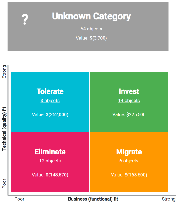 By default, the assessment analyzer finds all objects in the current project, checks their assessment categories, and displays the stats visually. The unknown category captures all objects that have no assigned assessment. All other categories will display underneath the unknown group across two axes: Business (functional) fit and Technical (quality) fit.