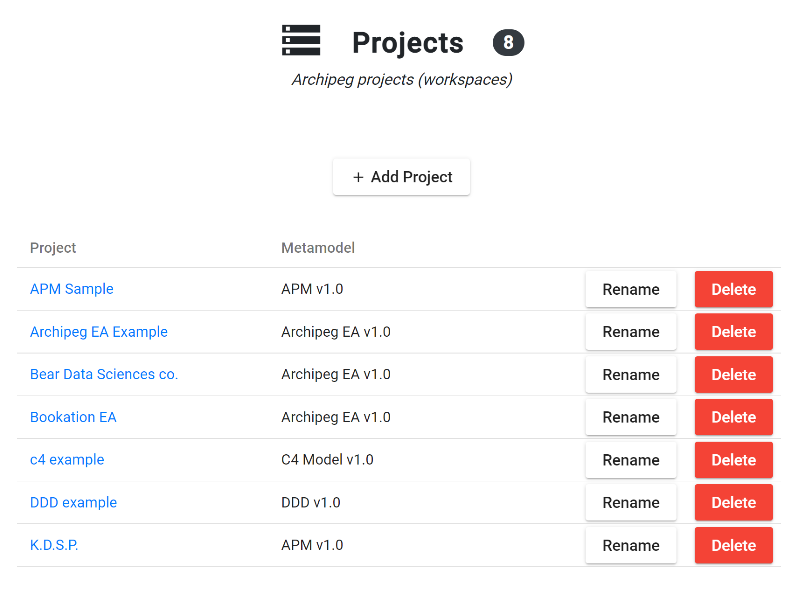 A project in Archipeg is a separately stored data set (i.e., a separate workspace) that includes a model and metamodel. Projects allow you to separate parallel workstreams, initiatives, or team efforts.